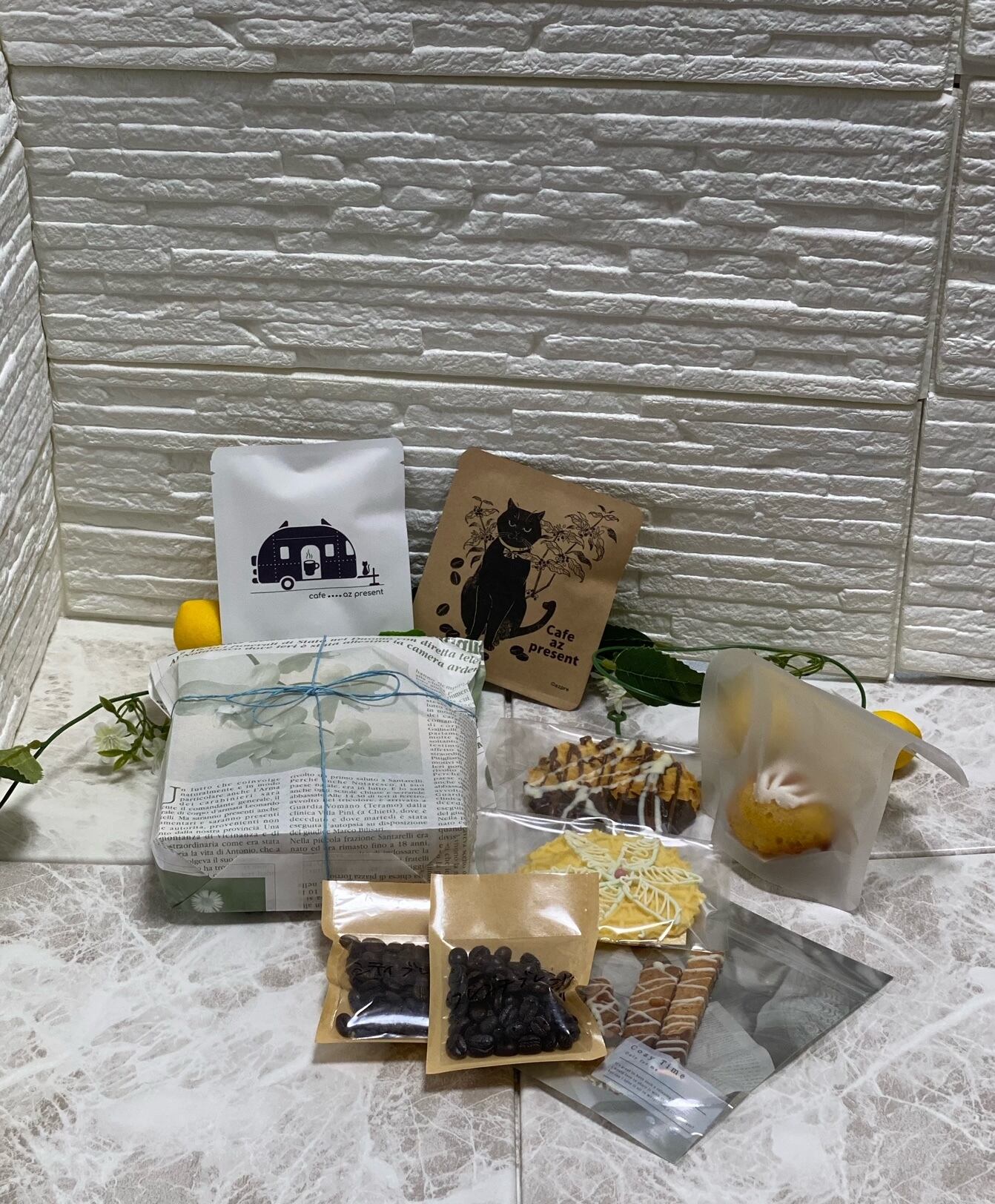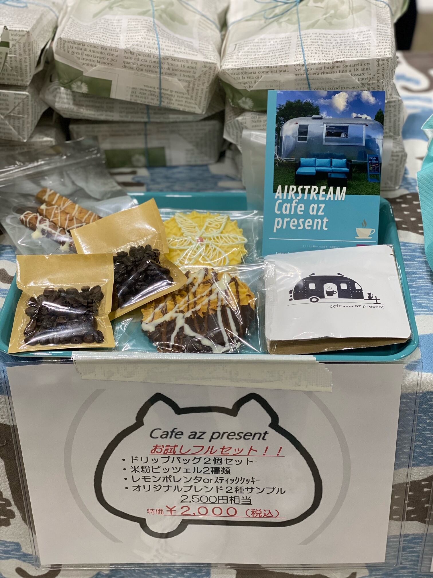 限定商品浅煎りドリップパック(フェアトレード商品)、深煎りドリップパック(フェアトレード商品)、米粉で作ったピッツェル(イタリアの焼き菓子)レモンアイシングとチョコ掛け、レモンポレンタ又はドライフルーツと塩のクッキー、オリジナルブレンド豆のお試し2袋